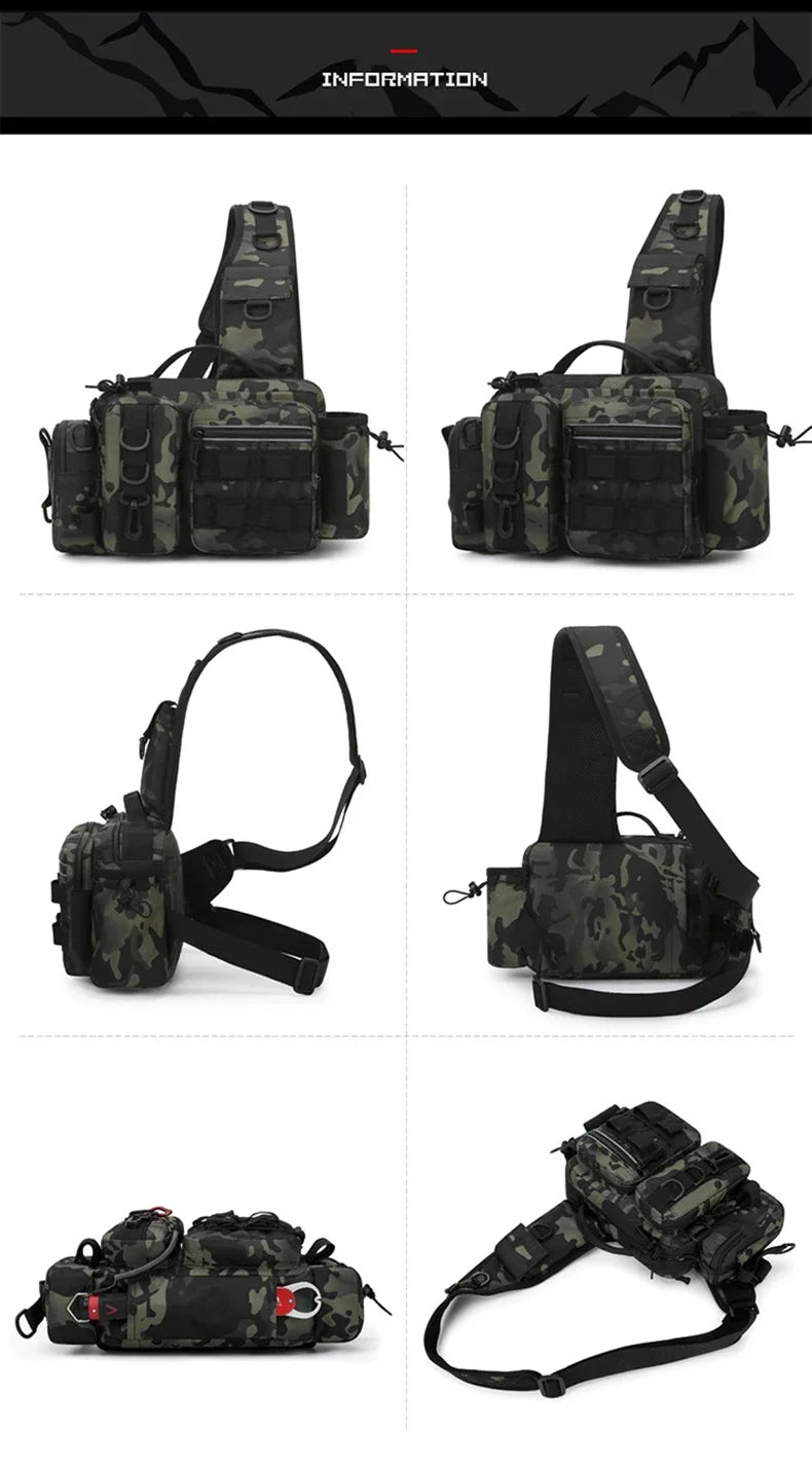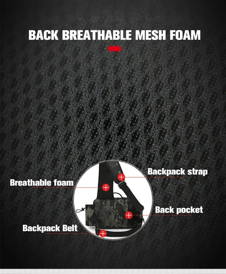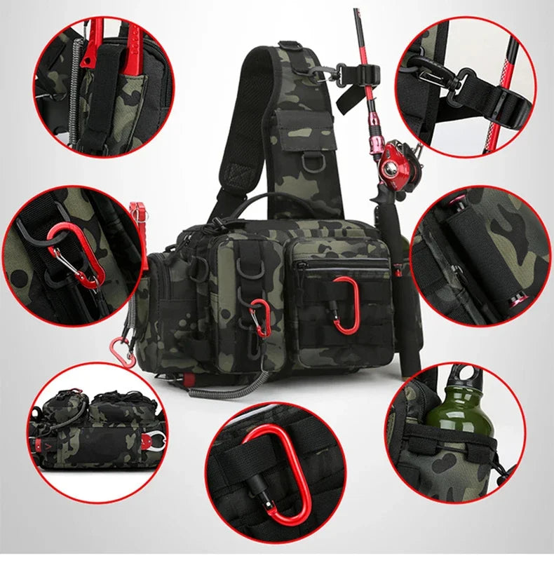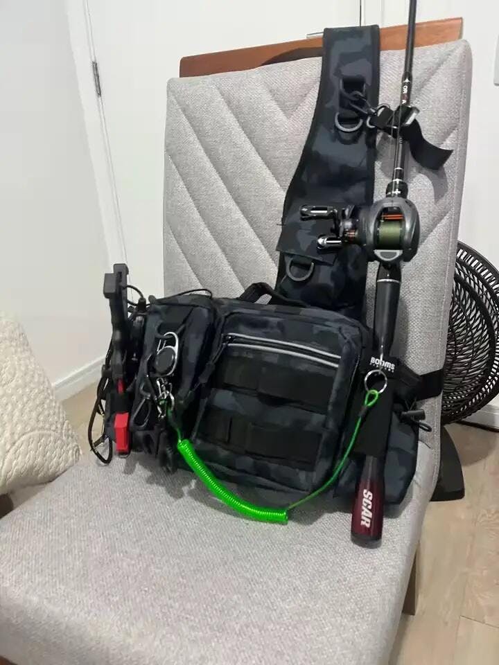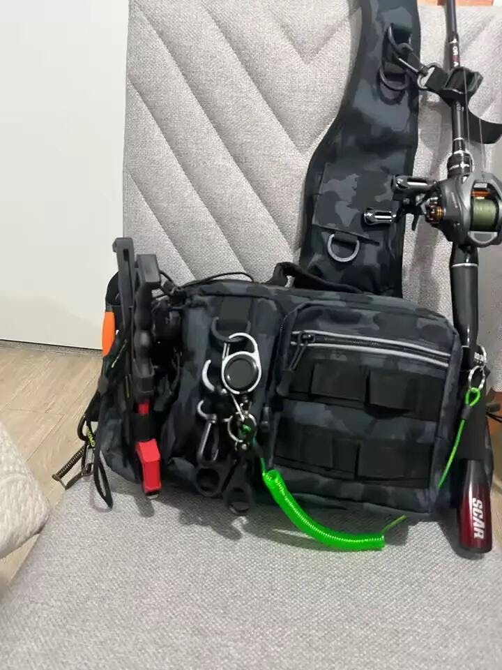 2️⃣計算された収納設計: ルアーケース、プライヤー、ラインカッター…。専用ポケットで迷わず素早くアクセス。ロッドホルダー付きで両手も自由に。