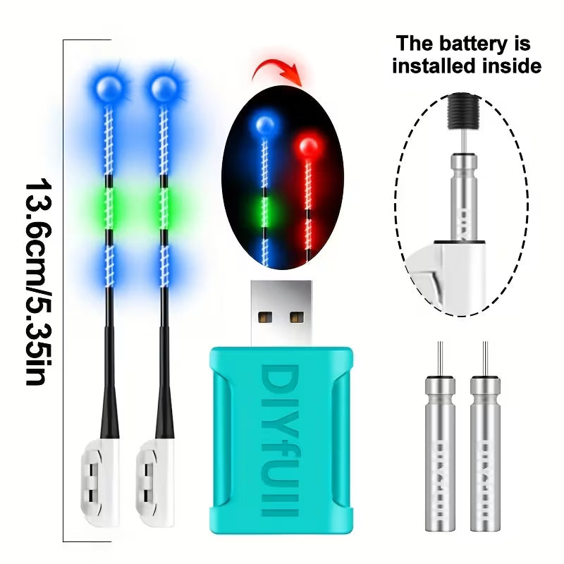 - すぐに使えるフルセット】 センサー本体×2、専用充電池×2、USB充電器がセットになっています。届いたその日から、あなたの夜釣りが進化します。